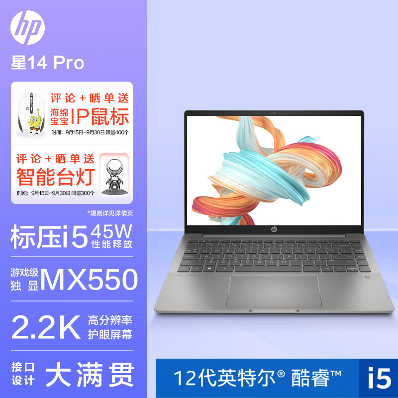 惠普HP 星14 Pro 14英寸高性能轻薄笔记本电脑(12代i5 16G 512G 2.2K高分屏 硬件护眼 MX550独显)陨石灰