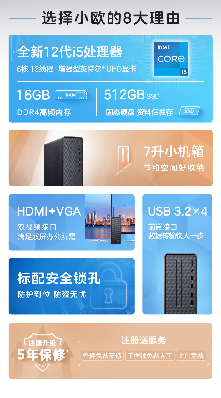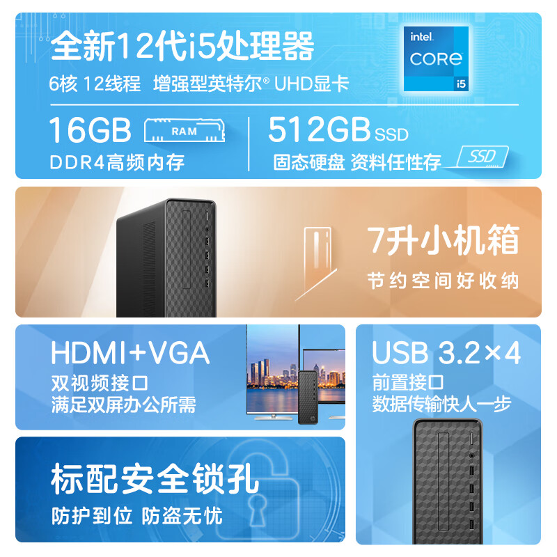 惠普HP小欧S01电脑主机 商务办公台式机 (i5-12400 16G 512GSSD WiFi Win11 五年上门)主机 自营